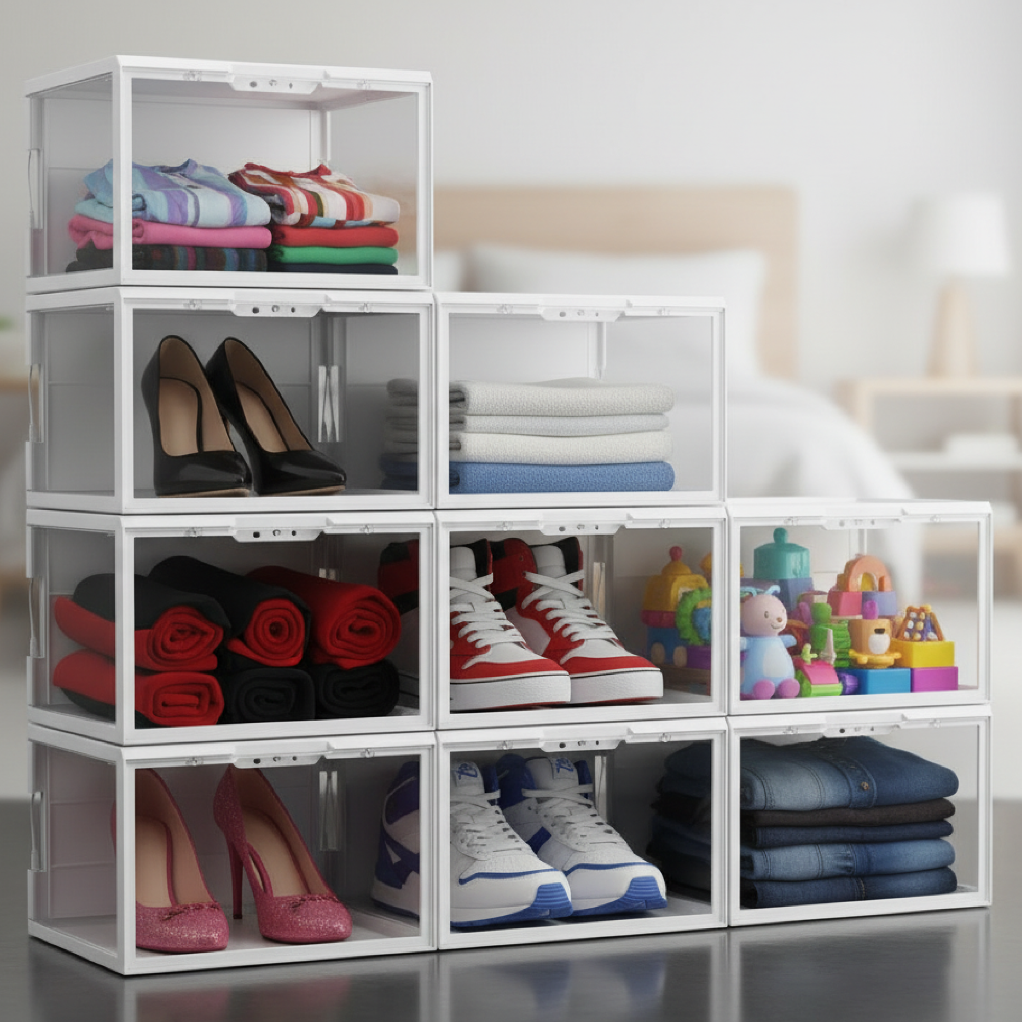 Yes. CrateKicks Vault is designed for shoes, heels, clothes, bags, accessories, collectibles, and everyday items. It’s a modular storage system, not a single-purpose shoe box.